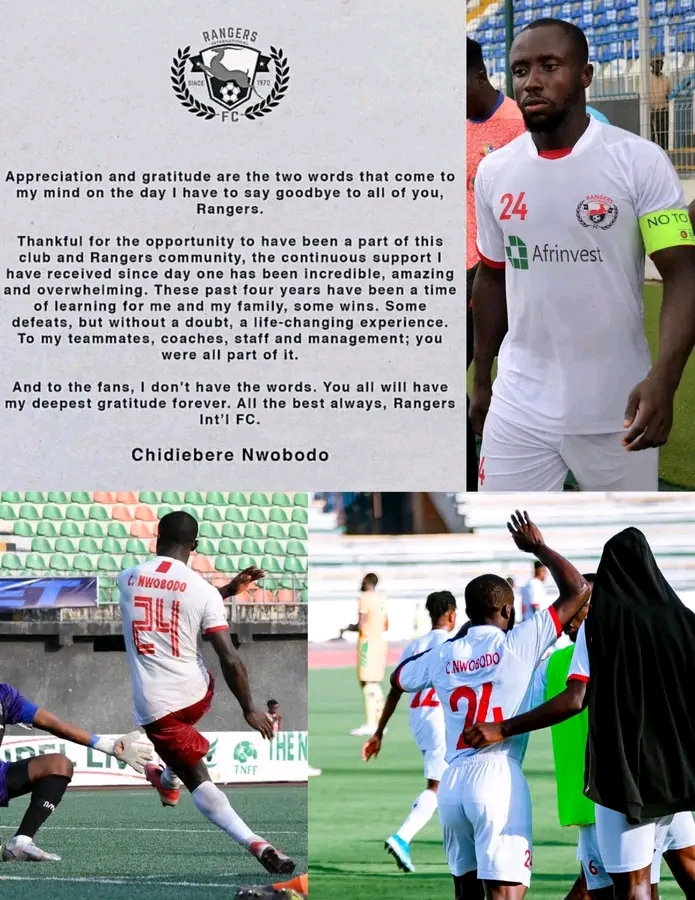 Rangers Int’l FC’s mercurial midfielder and captain, Chidiebere Nwobodo, has announced his departure from the Enugu side after four years with the Flying Antelopes.